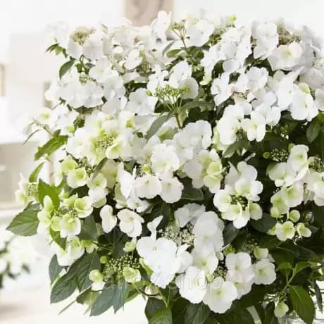 Соцветия окаймлены большими, элегантными стерильными цветками чистого белого цвета, часто более розовыми в холодную погоду. Количество цветков на соцветие, стерильных от 8 до 10, плодущих 330. Естественный сезон цветения с апреля по июнь-сентябрь. Высота соцветия 8,5 см, ширина 13,5 см. Высота в среднем 50,0 см, ширина 100,0 см.